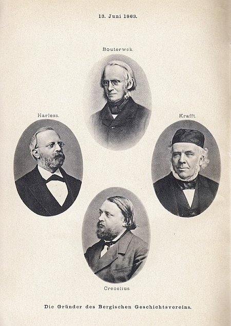 Der Legende nach trafen sich 1863 der Gymnasialdirektor Dr. Wilhelm Bouterwek und der Pfarrer Karl Krafft mehr oder weniger zufällig im Wartesaal am Bahnhof in Elberfeld. Es entwickelte sich ein interessantes Gespräch, in dem beide Herren auch auf ihre Studien zu sprechen kamen und beschlossen, einen historischen Verein zu gründen. Der 13. Juni 1863 gilt als der Geburtstag des Bergischen Geschichtsvereins. Im Konferenzzimmer des sogenannten ´alten Gymnasiums` in der Elberfelder Grünstraße traten schließlich acht Herren zusammen, um den Geschichtsverein ins Leben zu rufen.
