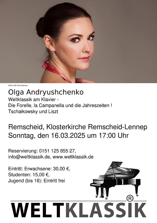 Bis 18 Jahre Eintritt frei, Erwachsene 30,00 €. Reservierung unter 0151 125 855 27, info@weltklassik.de oder www.weltklassik.de . Das Programm: Peter Tschaikowsky (1840 - 1893) - Die Jahreszeiten op. 37 bis 1. Januar - Am Kamin, 2. Februar - Karneval, 3. März - Lied der Lerche, 4. April - Schneeglöckchen, 5. Mai - Weiße Nächte, 6. Juni - Barkarole, 7. Juli - Lied des Schnitters, 8. August - Die Ernte, 9. September - Jagd, 10. Oktober - Herbstlied, 11. November - Auf der Troika, 12. Dezember - Weihnachten Franz Liszt (1811 - 1886) - Valse-Impromptu As-Dur S. 213 - Aus: Melodien von Franz Schubert S. 563 6. Die Forelle - Liebeslied - nach Robert Schumann S. 566 - Aus: Études d'exécution transcendante d'après Paganini S. 140 3. Campanella - Aus: Ungarische Rhapsodien S. 244 2. cis-Moll Olga Andryushchenko: Olga Andryushchenko ist eine in Moskau geborene Pianistin. Sie lebt in Deutschland und besitzt die deutsche Staatsbürgerschaft. Sie wurde am Moskauer Tschaikowsky Konservatorium, sowie an der Hochschule für Musik und Theater Hannover ausgebildet, wo sie ihr Konzertexamen ablegte. Sie erlangte mit zahlreichen Preisen und Auszeichnungen auf internationalen Wettbewerben große Aufmerksamkeit. Ihre internationale Karriere führt die Pianistin zu den bedeutendsten Musikfestivals Europas. Sie hat mit renommierten Dirigenten als Solistin zusammengearbeitet. Konzerte: Gewandhaus in Leipzig, Beethovenhaus in Bonn, Auditorium Conciliazione Santa Cecilia in Roma, Palais des Beaux-Arts in Brüssel, Concertgebouw in Brügge, Cite de la Musique in Paris, Oji-Hall in Tokio, Mariinski-Theater in St.Petersburg, R.Schumann-Saal in Düsseldorf, Rolf-Liebermann-Studio des NDR in Hamburg, Musiikkitalo in Helsinki. Olga Andryushchenko hat mehrere CDs aufgenommen. (Grand Piano Records, Melodiya, Alba Records). |