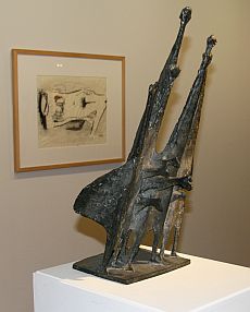 Umstand ist sicher wenigstens zum Teil die etwas krude Zusammenstellung geschuldet, die den Besucher beim Rundgang nach den ersten beiden kleinen und artig präsentierten Kabinetten im großen Raum der Wechselausstellung in ein Wechselbad von Impressionen stürzt. Da stehen ästhetisch barocke Stelen des Bildhauers, Malers, Graphikers und Fotografen Guido Jendritzko in vagem Zusammenhang mit schwarz-weißen Graphiken von seiner Hand, da gibt es Kenneth Armitages wunderschöne "Menschen im Wind" und schräg gegenüber Wilhelm Loths nachgerade billigen plakativ geschmacklosen "Spagat", der mehr über den Künstler aussagt, als dieser vielleicht möchte.