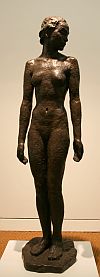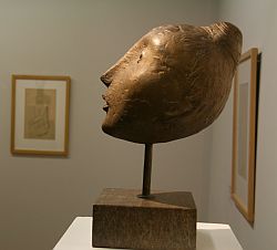 Schwippert "Dunja" genannt hat und dem ein zeichnerisches Portrait des gleichen Jahres (1958) zugeordnet ist. Flankiert wird Dunja von Arbeiten Erich Cleffs ("Büste C.R. Schmidt") und Milly Stegers ("Büste Editha von Moers"). Ein verheißungsvoller Auftakt. Der nächste Raum gehört drei ganz großen Namen: Georg Kolbe ist dabei allein mit vier Plastiken vertreten, darunter die stehende "Junge Frau"; zwei Arbeiten Wilhelm Lehmbrucks ("Geneigter Frauenkopf", "Freiherr von Steindecke") beeindrucken, und die an der Klassik orientierten beiden "Badenden Mädchen" zeigen Max Klingers Perfektion. Übrigens: die beiden "Badenden", von denen eine noch die Brandschäden des Krieges erkennen läßt, sind durchaus nicht identisch. Mal genau hinsehen.