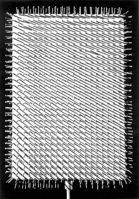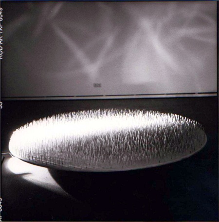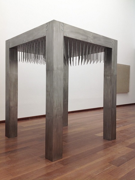 Das besondere an der kleinen Schau: Die präsentierten Werke stammen fast alle von privaten Sammlern, die sich mit Uecker „freundschaftlich verbunden fühlen.“ Die Arbeiten zeigen gleichzeitig die Geschichte dieser jeweiligen Freundschaft, so Könches beim Rundgangs. Eine Arbeit heißt „Licht-Regen“ und stammt von 1967. Da hängen rund 30 drei Meter lange und hohle Stahlstangen von der hohen Decke bis knapp über den Boden. Durch dünne, lange Schlitze in diesen Rohren scheint helles Licht. Die Skulptur kann und soll durchschritten werden wodurch Schwingungen entstehen und Berührungen geschehen. Decke und Wände in Ueckers ehemaliger Werkstatt in der heutigen Zero-Foundation sind weiß getüncht. Eine kleine, 2013 nach einer China-Reise des Künstlers entstandene Arbeit trägt den Titel „Kleiner chinesischer Tempel“. Ursprünglich hatte ein Freund Ueckers für seine Frau von der Reise ein „typisches Chinalack-Döschen“ mitbringen, erklärt Barbara Könches. Er brachte stattdessen aus einem altmodischen Geschäft in Peking schlicht eine „Dose mit rotem China-Lack“ mit. Viele Jahre später, die Dose mit dem Lack war bei Uecker gelandet, bemalte der neun runde Holzstäbe mit dieser Farbe, legte einen Holzboden auf und schlug nahlreiche längere Nägel hinein, die den Tempel darstellen sollten. Mehrere auf Holz genagelte Werke mit Titeln wie „Spirale“, sind in der Ausstellung zu bewundern, eine andere Arbeit zeigt einen dunkelbraunen, quadratischen Holzrahmen der nach Außen und und zum Betrachter hin mit unzähligen Nägel bestückt ist. Manche der Arbeiten tragen schlicht den Titel „o.T.“ andere wie etwa „Obekt Weiß“ von 1961 zeigen in Holz geschlagene Nägel, die in viele unterschiedliche Richtungen zeigen. „Das zeigt auch, daß und wie sich Freundschaften in unterschiedliche Richtungen hin entwickeln können“, so die Geschäftsführerin der Zero-Foundation.
