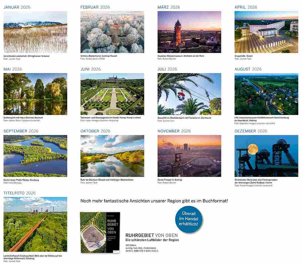 Der Kalender Ruhrgebiet 2026 zeigt einige der schönsten Seiten der fas ein Jahrhundert als von der Montanindustrie vergiftete und kohlenstaubgeschwärzte Region, die sich in den letzten Jahrzehnten grundlegend gewandelt hat. Zwar bedauern viele Menschen das Verschwinden der Kohleförderung und -verarbeitung mit ihrer Bergbau-Tradition und trauern dem romantisch verklärten Schmuddelimage nach, doch begrüßen wohl die meisten den Wandel zu einer immer grüner werdenden Kulturregion mit sauberen Flüssen, klarer Luft und neuen Freizeitflächen. Die erhalten gebliebenen Industriedenkmäler wie die Fördergerüste der Zeche Radbod in Hamm, die Zeche Prosper II in Bottrop, das Hüttenwerk Duisburg und das Schiffshebewerk Henrichensburg teilen sie die großformatigen Kalenderbilder u.a. mit der Elfringhauser Schweiz, dem Schloßpark Bochum, Schloß Bladenhorst und der Duisburger Sechs-Seen-Platte. Jochen Tack, Hans Blossey, Ruben Becker, Joachim Jockschat und Barbara Buderat sind die Fotografen.