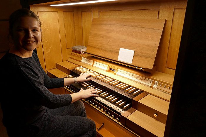 Ernst Pepping (1901-1981) war wohl der bedeutendste protestantische Kirchenmusiker des 20. Jahrhunderts. Vor allem seine geistlichen Chorwerke wurden auch nach dem Krieg von vielen Chören immer wieder aufgeführt. Gebrauchsmusik für den Nationalsozialismus hat er nicht komponiert, erschien aber auf der Gottbegnadetenliste Hitlers. Seine Toccata „Mitten wir im Leben sind“(1941) startete Mona Hartmann mit vollem Werk. Über stampfendem Pedal entwickelte sich ein Choralthema, welches später unruhig in die Mitte wanderte. Reich registriert, spiegelten unruhige Einwürfe hoher Register Unruhe und Seelenangst, bis zuletzt des Glaubens Gewissheit in strahlendem Dur ins Kirchenschiff schallte. Technisch souverän, gestalterisch stark beeindruckte Mona Hartmann (geb. Rozdestvenskyte) mit diesem Werk. Geboren 1994 in Moskau, studierte sie Orgel in Detmold und Leipzig, gewann zahlreiche internationale Orgelwettbewerbe (darunter u.a. St Albans Organ Competition (UK), Boston Nach Competition Boston (USA), Internationaler Orgelwettbewerbe Wuppertal) und konzertiert in vielen europäischen Ländern. Seit 2022 unterrichtet sie Orgelliteraturspiel an der Hochschule für Kirchenmusik Herford.