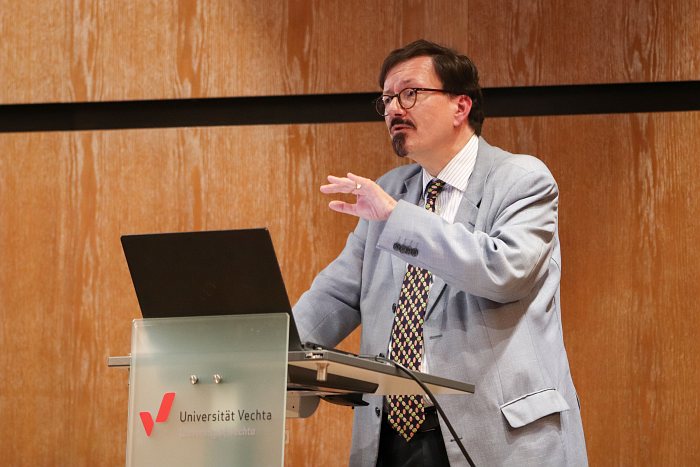 Wörter als Spiegel der Kulturgeschichte; Aussterben der historischen Sprachwissenschaft; Kritik am Zeitgeist-Enthusiasmus für KI-Systeme; ganz im Sinne der Tiefenanalyse der germanistischen Sprachwissenschaft: Was Prof. Dr. Jochen A. Bär während seines Eröffnungsvortrags der Ringvorlesung „Wissen ermöglicht Wandel“ an der Universität Vechta präsentierte, war ein Plädoyer für das kritische Hinterfragen moderner Prozesse und ein Hinweis auf den bevorstehenden Untergang einer ganzen Fachdisziplin.