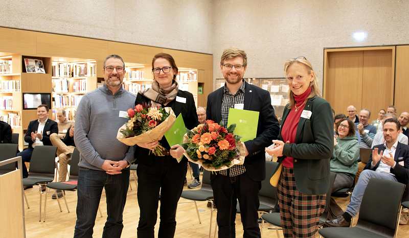Uni-Rektorin Prof. Dr. Birgitta Wolff (re.) und Prorektor Prof. Dr. Stefan Kirsch (li.) gratulierten Dr. Sophia Victoria Krebs (2.v.l.) und Dr. Kai Brinkmann (2.v.r.) zum Publikationspreis. Der dritte Preisträger Dr. Pang Wang war am Abend verhindert und fehlt daher auf dem Foto. // Foto Friederike von Heyden