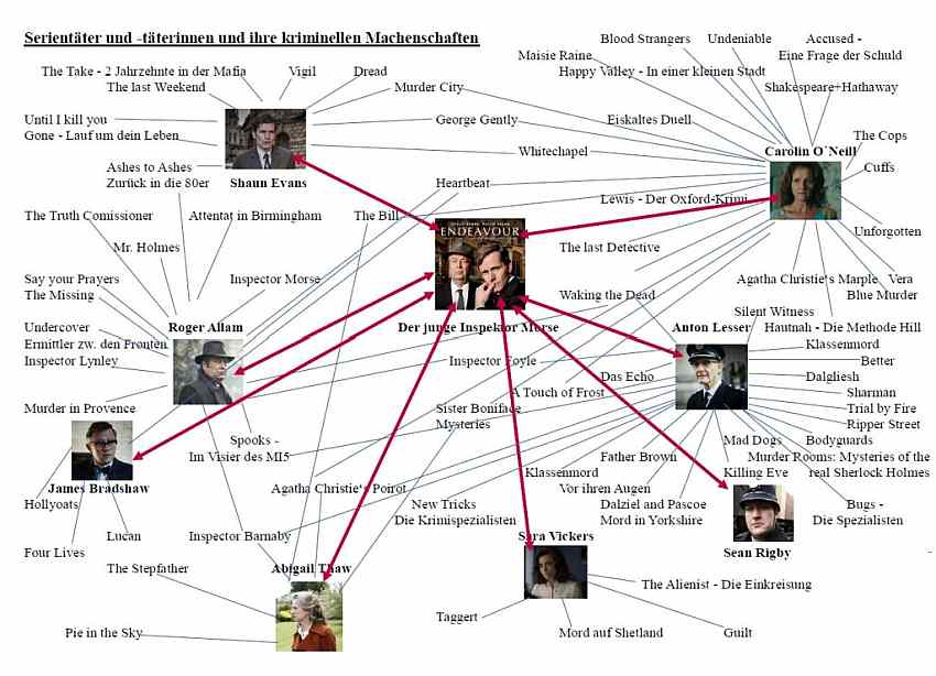 Ein wenig erinnert der von Shaun Evans brillant dargestellte junge Kriminalist, auch mit seiner Vorgeschichte, an die Figur seines Nach-Nach-Nachfolgers Hathaway, wortkarg, ernst, mit feiner Beobachtungsgabe und einer abgebrochenen akademischen Ausbildung, ein Kenner Oxfords und seiner Hochschul-Gegebenheiten. Zwar ungünstig für einen Mordermittler hat Endeavour Morse eine heftige Abneigung gegen Leichen, doch das hält ihn nicht von der Klärung seiner Fälle ab. Detective Constable Morse verschafft sich trotz erster heftiger Reibungen mit mißgünstigen Kollegen und arroganten Vorgesetzten durch seinen scharfen analytischem Verstand sehr schnell einen gewissen Respekt bei beiden Gruppen, vor allem aber bei seinem unmittelbaren Chef, Detective Inspector Fred Thursday (Roger Allam), der seine Qualitäten erkennt und die Hand schützend über den gelegentlich widerborstigen, sturen Morse hält. Und er gewinnt die Freundschaft des unentbehrlichen Police Constable Jim Strange (Sean Rigby).