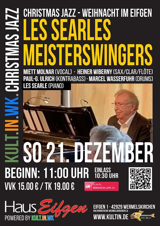 Ein Dezember ohne „Christmas Jazz“ ist kaum vorstellbar. Mit Les Searle und den Meisterswingern wird beswingt die Weihnachtszeit eingeläutet. Deshalb werden natürlich auch dieses Jahr wieder jazzige Klänge das Obere Foyer im Teo Otto Theater erfüllen. Gute Laune und wippende Füße sind garantiert. Die Meisterswingers bringen viel Big Band Erfahrung mit. Auch einige Swing Melodien aus der Big Band Ära. Den Erfolg des Konzerts erklärt Les Searle so: „Vier Elemente gehören zum Erfolg von Christmas Jazz. Drei davon: Melodie, Harmonie und Rhythmus können wir maßgeblich beeinflussen. Das vierte – das Wetter – liegt allerdings nicht in unserer Macht. Aber, wir werden - wie immer - unser Bestes geben“. Teo Otto Theater, Oberes Foyer: Beginn 18.00 Uhr Preise: 15,- €; Jugendticket: 5,- € Rabatte: TheaterCard, Teos RemscheidTicket