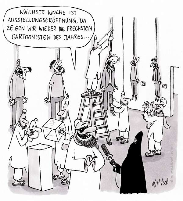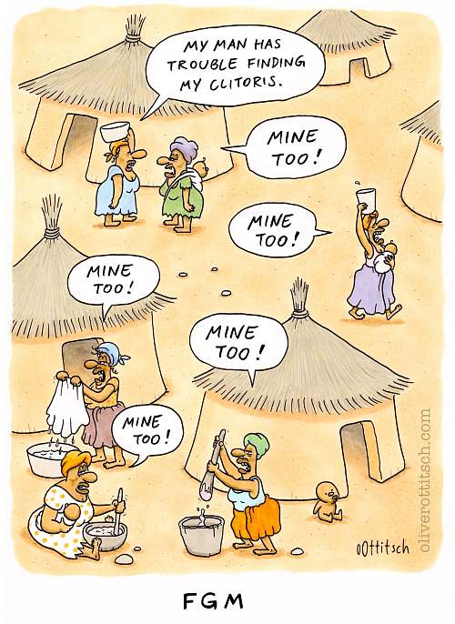 Ob es um Religion geht - suchen Sie sich eine aus, mit Kreuz, mit Bart, mit Bejkeles oder mit Turban -, ob um die politische Neuordnung in Mitteleuropa, um Sexualität in Variationen, um Kunst, Kultur, Knackwurst oder Klimawandel, Ottitsch hat die Antworten auf Fragen parat, die er mit scharfem Blick auf die momentanen Verhältnisse selber stellt. Daß unter den Hirse stampfenden Damen im Kral keine ist, die nicht beklagt, ihr Mann könne ihre Klitoris finden erklärt sich ebenso schlüssig wie die Ursache für Edvard Munchs „Der Schrei“ oder der tiefere Sinn hinter der Anschaffung einer Smartwatch. Wie wichtig der morgendliche Bürokaffee ist und woher Nike seinen Werbespruch hat, wie sich Architekturkritik äußern kann und wie man mit einem öffentlichen WC gleich zweimal verdient, sind nur ein paar der Beispiele aus Ottitschs satirischem Rundumschlag. Meisterliche Blasphemie und unfaire Schläge unter die Gürtellinie (wobei Burkas, Tschadors und Kaftane meines Wissens keine Gürtel haben) sind wie gezielte Geschmacklosigkeiten, um der Sache gerecht zu werden, eine Spezialität des kompromißlosen Chronisten mit dem Zeichenstift.