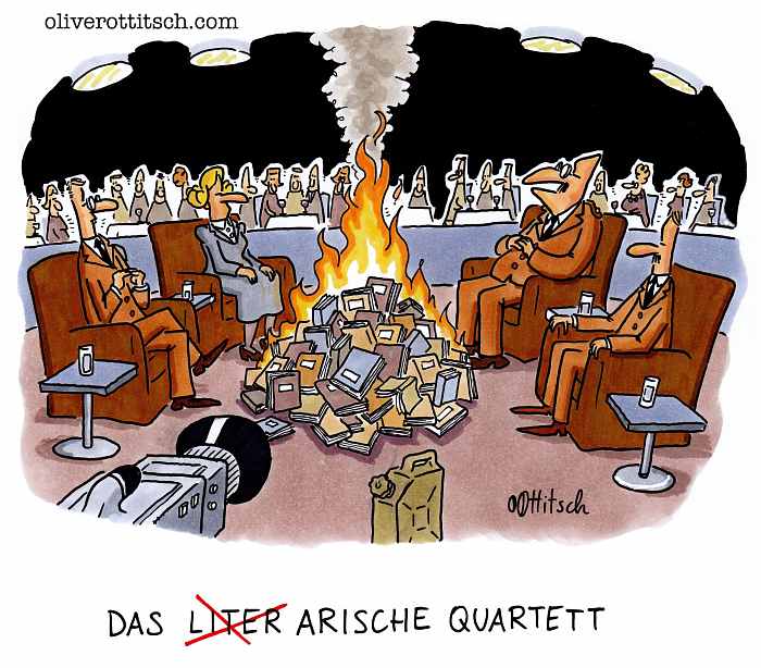 Das betrifft aber auch das Buch mit dem nämlichen Titel „Smiley von hinten“, auf dessen Deckel wir den kleinen Scheißer in aller Unschuld abgebildet sehen. Denn auch diese bisher umfangreichste Werkschau mit Auszügen seines unermüdlichen gekonnten Beleidigens, Schmähens, Verballhornens und durch-den-Kakao-Ziehens hat das Zeug dazu, ein Bestseller zu werden. Den Diamanten konnte ich schon immer unterstreichen, das Ungeschliffene schon seinerzeit nicht. Damals wie heute längst mit Schliff auf Augenhöhe mit großen Kollegen wie Manfred Deix und dem besagten Gerhard Haderer legt Oliver Ottitsch hier eine Sammlung Cartoons vor, die mal wieder kein Fettnäpfchen ausläßt – mit Vorsatz notabene. Und genau so soll das sein.