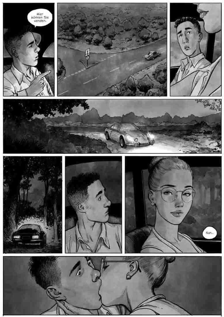 So zeichnet Luigi Critone (u.a. Francois Villon-Illustrator) in „Militärdienst“, der ersten Geschichte des Bandes mit wunderbar ästhetischen und humorvollen Panels den zunächst recht schweren, schließlich unbeschwert leichten Gang eines jungen Soldaten zu seinem ersten erotischen Erlebnis. Die heitere, in s/w-Tönen gehaltene ebenso zarte wie explizit erotische Bildfolge ist ein brillanter Appetizer zum Einstieg in diese knisternde Sammlung.