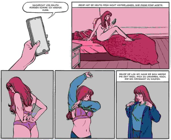 Auf zeichnerisch ähnlich hohem Niveau läßt Michelle Reviglio in „Valentine's Day“ die Leser an den Phantasien eines Paares von Sex in der Öffentlichkeit teilnehmen. Was sie sich zum Valentines Day schenken und auch benutzen – schauen Sie selber, liebe Leserin. Ein köstliches und witziges Verwechselspiel hat Octavie Delvaux für die Zeichnerin Chloé Cavalier mit „Das Halsband“ entworfen und mit einer feinen Pointe ausgestattet. Raven erzählt ebenso hochwertig die Selbstbefriedigungsträume einer Süchtigen wie Chérie es in „Inmitten der Landschaft ein Fluß“ mit der Rückbesinnung einer jungen Frau auf ihre Jugend und die Entwicklung ihrer heftig ausgelebten Sexualität tut.