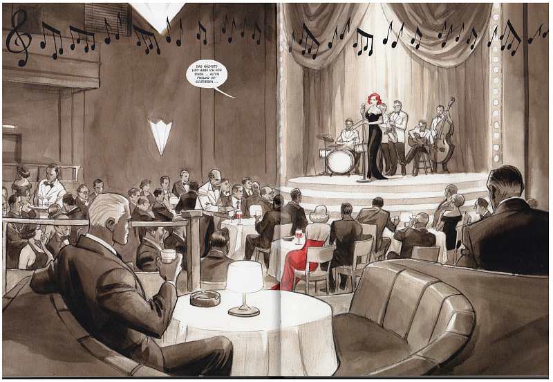In düsteren Brauntönen gehalten, die nur Rot als Kontrastfarbe zulassen (Frauenfrisuren und –kleider, Blut, Makeup, Ketchup…) sind die Panels Bild für Bild ein hundertprozentiger Genuß. Hier ist ein Detailverliebter Könner am Werk, der das Zeit- und Lokalkolorit der Story bis aufs i-Tüpfelchen eingefangen hat und als Gesamtkunstwerk umsetzt.
