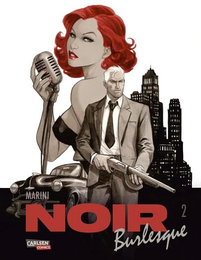 Sie mögen die Kriminalromane von Mickey Spillane, Day Keene, Carter Brown, Raymond Chandler und James Hadley Chase? Dann sind Sie hier richtig. Der italienische Comic-Zeichner Enrico Marini hat deren Genre der knallharten US-Detektive, Cops und Gangster und der verführerischen Halbwelt-Dämchen der 40er und 50er Jahre für eine Story in allerbester rabenschwarzer Hardboiled-Tradition aufgenommen. Eine Hommage an den amerikanischen Film Noir der 1950er-Jahre, die der Carlsen Verlag nun in zwei brillanten Hardcover-Bänden vorlegt: „Noir Burlesque“. Da steckt schon im Titel drin, was die Geschichte üppig zu bieten hat – finsteres Geschehen, Blaue Bohnen und laszive Erotik.