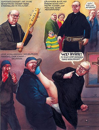 Aber es genügt ja schon, im eigenen Land mit Teeren und Federn bedroht zu sein. Von Elfriede Jelinek, Homos und Heteros, DJ Ötzi, Bären-Freunden, Hermann Nitsch-Verehrern, Jörg Haider-Epigonen, dem Vatikan und anderen Trachtenvereinen wollen wir gar nicht erst anfangen, wenn uns die auch auf Schritt und Tritt in diesem prächtigen (tatsächlich goldenen) Wälzer begegnen. Sollte der deutsche Leser all die angeprangerten Perversionen, Skandale, Lächerlichkeiten und aufgedeckten Lügen auf die Verhältnisse seiner Republik hochrechnen und von Deix zeichnerich aufarbeiten lassen, käme eine monumentale Nestbeschmutzung von fast 3300 Seiten dabei heraus. Aber was heißt schon "Nestbeschmutzung"? Manfred Deix tut nur, was andere sich nicht trauen: er lüpft den schützenden Vorhang, hinter dem sich eine fröhliche Friede-Freude-Eierkuchen-Gesellschaft, die korrupte Politik, eine skrupellose Wirtschaft und der nachgerade pervertierte Kunstbetrieb zu verstecken suchen, um ungestört weiter den unanständigen Geschäften nachgehen zu können.