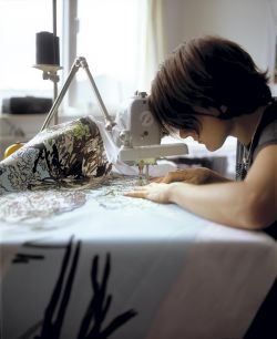 Künstler-Gespräch mit Rowena Dring im Von der Heydt-Museum, Wuppertal Rowena Dring verbindet auf einzigartige Weise digitale Bearbeitungsverfahren mit der traditionellen Handarbeit des Nähens. Als Grundlage dient ihr ein Foto, das sie mit Computerprogrammen abstrahiert. Die zumeist landschaftlichen Motive sind häufig an Schauplätze aus berühmten Werken der Weltliteratur angelehnt. Zahllose buntfarbige Stoffstücke werden dem Entwurf entsprechend mit Nähmaschine und schwarzem Garn zu einer Gesamtkomposition vernäht. Es entstehen romantische, zugleich sehr geordnete, künstliche und farblich komplexe Idyllen.
