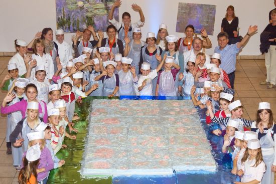Für die Seerosenbearbeitung wurde die riesige Torte in 10 Rechtecke geteilt, die jeweils 3 Kinder mit den eingefärbten Buttercremes bearbeiteten. Das Motiv entstand frei – zur Unterstützung und Inspiration der jungen Zuckerbäcker standen viele Reproduktionen der berühmten Seerosenbilder im Museumsfoyer. Zum Schluß wurden die Tortenstücke dann wieder zu einer Torte – einem Seerosenbild - zusammengeschoben.
