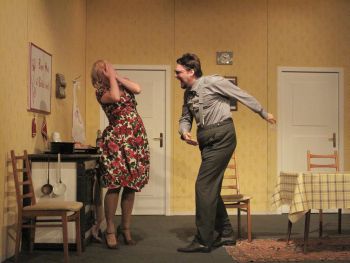 Verena Sander gibt subtil tragikomisch die sich für einen kurzen Wahn im Bewußtsein ihres Wertes aus der ehelichen Unterdrückung befreiende junge Ehefrau. Sie verleiht dem braven, vernachlässigten, doch begehrenswert drallen Weibchen im 50er Jahre Blumenkleid besonders liebenswerte Züge. Ihr fühlbarer Kummer und ihre Liebessehnsucht greifen ans Gemüt. Auch sie hat eine Gegenspielerin: die Nachbarin Gertrud Deuter (Pascale-Viviane Flückinger), die sich um der Sensation willen als Freundin anbiedert, um auf ihre altjüngferlichen Tage wenigstens aus der zweiten Reihe einmal von der Unmoral kosten zu können. Daß schließlich sie die einzige ist, die erotischen Profit aus der kuriosen Konstellation zieht - sieht man von Maske („Zu seinem Glück ist der Mensch berechtigt!“) ab, der ihr die spontane „Packung“ gibt - ist Teil der Ironie, die dem Stück aus allen Knopflöchern platzt. Das für diese Szene von Lolita Erlenmaier geschneiderte Kleid rückt Flückinger als ernst zu nehmende Konkurrenz für die (jungen) Kessler-Zwillinge ins Licht. Da wir grade über ein Kleid sprechen: auch die übrigen Damengarderoben von der Hand Lolita Erlenmaiers müssen lobend erwähnt werden. Ob Hauskleid, elegantes Cocktailkleid (mit einreihiger Perlenkette), besagtes Babydoll, großes Geblümtes oder Stufenschnitt – jedes Stück einen Seufzer wert - und die Frisuren der Damen: göttlich! Claudia Sowa ist mit einem hochmotivierten Ensemble eine intelligente und höchst amüsante Inszenierung gelungen. Ein spritziger Theaterabend mit Tiefgang, der eine nachhaltige Empfehlung wert ist.