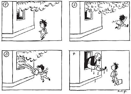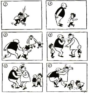 Liebenswert und durch und durch menschlich Die Liste der Buchveröffentlichungen von "Vater und Sohn"-Geschichten verzeichnet bei Drucklegung im Jahr 2000 von 1935 bis 1999 insgesamt 32 Ausgaben in Deutschland (nach dem Krieg in Ost und West), Brasilien, Persien und Frankreich. 2003 kam zum 100. Geburtstag Ohsers mindestens noch ein Band dazu: eine Edition der Deuteschen Post AG "Die schönsten Vater & Sohn-Geschichten" mit einem Sondermarken-Block. Es gab in vielen internationalen Zeitungen Abdrucke der Zeichengeschichten, Trickfilme, Verwendung als Werbeträger u.v.a.m.. Es kann nicht wundern, ist doch die Sprache des Ohserschen Humors international. Nehmen wir ein berühmtes Beispiel in den Blick unserer Betrachtung: Sohn prügelt sich auf der Straße mit einem gleichaltrigen Knaben. Beide holen heulend ihre Väter zu Hilfe. Nun kriegen sich vor den Augen der neugierig zuschauenden Sprößlinge die Väter in die Wolle und prügeln sich nun ihrerseits - während die Buben friedlich miteinander Murmeln spielen (siehe oben). Oder zitieren wir hier zu einem weiteren Bildbeispiel Joachim Klinger aus der Musenblätter-Serie "Sprachlos komisch: » "Sohn" erschrickt bei der Heimkehr. Aus dem Fenster des Vaterhauses quillt dichter Rauch. "Vater" muß gerettet werden! In hohem Bogen entleert "Sohn" einen Eimer mit Wasser in Richtung Feuer. "Vater" erscheint durchnäßt am Fenster und deutet vorwurfsvoll auf die erloschene Pfeife... «(siehe unten). Das alles geschieht und funktioniert der unmißverständlichen Aussage des Zeichenstifts wegen ohne Worte.