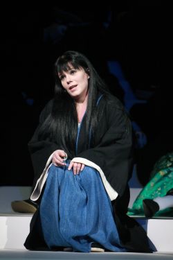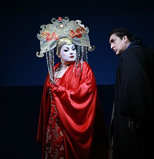 Calaf, der Kolumbianer Ernesto Grisales, war ihr ein ein ebenbürtiger „Gegner“. Seine lyrische Stimme, die aber auch mühelos dramatische Ausbrüche trägt, seine heldische Erscheinung, gestaltet den Tatarenprinzen als glaubwürdigen, bedingungslos Liebenden, der bereit zur Selbstaufgabe ist. Das andere, das eigentlich tragische Paar, in diesem ursprünglich von Gozzi als Komödie konzipierten Stück sind Timur und Liu. Michael Lion gibt dem entthronten Tatarenfürsten menschliche Tiefe. Sein profunder Baß, seine unbedingte Hingabe an die Konzeption der Regie zeichnen einen vom Schicksal gebeutelten Menschen, der nur mit Hilfe seiner Sklavin Liu überleben kann. Und eben diese Liu wird von der jungen Finnin Sofia Kallio gegeben. Die Strahlkraft ihrer Stimme bewies sie schon als Pamina und Gilda, aber ihre Liu übertraf alle Erwartungen. Perfektion in Stimme und Darstellung jenes unglücklich verliebten Mädchens.