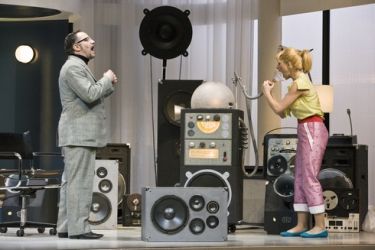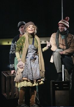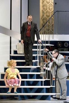 Während die MiR-Zuschauer nach der Pause wieder ihre Plätze eingenommen haben, ist es gegen 3.00 Uhr früh auf der Bühne. Higgins und Pickering sind recht angetrunken und loben sich gegenseitig über den gr(i)ünen Klee, daß sie Eliza so haben verändern können. "Sie sind's, der das geschafft hat..." singt der Oberst und als der Professor zu Eliza sagt, ihm sei es egal, was sie von jetzt an machen werde, da sucht die Hübsche nicht das Weite, sondern zunächst wieder den Opernvorplatz, wo die Gemüseverkäufer sie für 'ne feine Dame halten, sie nicht wiedererkennen und ihr wieder mal betrunkener Vater sein Hochzeitslied "Bringt mich pünktlich zum Altar" trällert. Zu dem führt offensichtlich auch Oberst Pickering die Hausdame von Higgins, Mrs. Pearce.