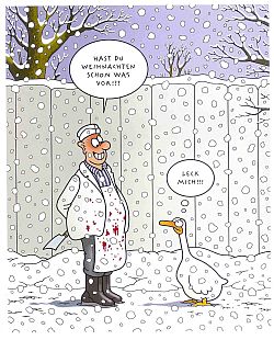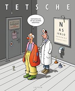 Regelmäßige Stern-Leser und andere Freunde absurden Humors wissen seit fast 30 Jahren: wenn auf einem Cartoon in wechselnder Zusammensetzung (oft genug in Häufung) gewisse Elemente auftauchen, kann dahinter nur einer stecken, der den Ernst des Lebens ganz und gar begriffen hat - und dem energisch gegensteuert. Tetsche. Fans muß ich es nicht erzählen, aber denen, die seine kostbaren und köstlichen Einfälle noch nicht so richtig kennen, gebe ich gerne ein paar Stichworte. Ein geballte Witz-Ladung der besonderen Art gibt Anlaß: Tetsches neuer Sammelband "Hoffentlich ist es nichts Ernstes". Nee, keine Sorge, ist nichts Ernstes. Der opulente Band offeriert auf 205 farbigen Seiten ein üppiges Angebot von Lachgeschichten mit dem bekannten und beliebten Tetsche-Personal. Schlachter Düwermann hats immer gerne mit der Gans, die Couch des Psychoanalytikers ist reichlich frequentiert, Freund Hein hat die Sense geschultert, der Onkel Doktor ist ratlos wie stets, Frösche, Fische, Pinguine, Schweine und Igel tummeln sich, lustige Rebusse schärfen den Verstand, bunte Briefmacken machen Lust auf Post, kleine Comic-Strips und Bildmontagen ergötzen, und Suchbilder könnten dazu verleiten, in dem schönen Buch herumzukritzeln (man will ja schließlich die gefundenen Fehler einkreisen!). Tetsche schafft eine skurrile Welt, in der vieles stimmt, weil er es mal andersrum sieht und in der Dinge passieren, die wir uns schon lange gewünscht haben. Wenn die Sterne nicht gut stehen (S. 181), läßt Tetsche keinen Zweifel daran, daß man bei der Christlichen Seefahrt das Segel streichen nicht zu wörtlich nehmen sollte wird auf Seite 41 deutlich gemacht, wenn bei Tetsche ein Mutiger den Gipfel erklimmt, war gewiß schon vor ihm jemand da, im Zweifelsfall Tetsche selber. Die Spurenlage auf Seite 102 weist jedenfalls darauf hin. Tetsche lehrt, daß man auch mal loslassen können muß, daß Liebe zwischen Menschen durchaus enttäuschend,