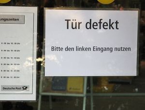 Der großzügig verglaste Eingangsbereich ist zum Nadelöhr geworden, denn die rechte Seite des sich früher einmal durch ein kleines technisches Wunder einladend und automatisch öffnenden Portals ist seit der gleichen Zeit außer Betrieb. Ein in die Glastür geklebtes Schild weist - vermutlich seit etliche Kunden sich dort schon den Schädel eingerannt haben - auf den Defekt hin. Behoben wird er nicht. Die Uhr bleibt stehen. Jetzt frage ich Sie: Wo ist das ganze Geld geblieben, das die Deutsche Post AG emsig erwirtschaftet? Hat man damit Thomas Gottschalks Gummibärchen-Sammlung finanziert, werden davon rauschende Feste in den Vorstandsetagen gefeiert - oder ist es gar wieder einmal in der Schweiz gelandet?