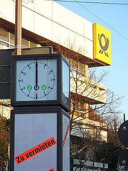 Nun ist das Unternehmen Deutsche Post (damit es ihm besser geht) privatisiert worden und an die Börse gegangen, hat (damit es Geld spart) Briefkästen abgeschraubt, Filialen geschlossen und Leute entlassen und erhöht (um ordentlich Geld zu scheffeln) alle paar Wochen die Gebühren für diese oder jene Dienstleistung. Aber: es scheint nicht zu gelingen! Bereits mindestens seit Mitte Dezember 2009 - jetzt ist die Mitte des Monats Februar 2010! - ist das äußere Bild des Wuppertaler Hauptpostamtes am Kleeblatt/Blücherbrücke in einem beklagenswerten Zustand. Die Normaluhr vor dem wuchtigen Betonklotz zeigt seither eisern 12.00 Uhr, kein Zeiger rührt sich mehr. Wen wundert es, daß niemand die Werbefläche unter der dauer-kaputten Uhr mieten möchte.