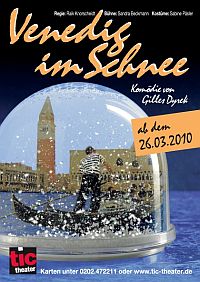 "Venedig im Schnee" von Gilles Dyrek Eine Komödien-Inszenierung á la bonheur Inszenierung: Raik Knorscheidt - Bühne: Sandra Beckmann - Kostüme: Sabine Päsler - Technik: Waltraut Rettig, Ingrid Sommerfeld Besetzung: Elisabeth Wahle (Natalie) - Torsten Kress (Jean-Luc) - Sabine Henke (Patricia) - Christof Heußel (Christophe) Premiere am 26. April 2010 Schreckliche Gutmenschen - peinlich verliebt Unerhörtes Tempo von der ersten Szene an bestimmt diese Inszenierung der intelligenten Komödie "Venedig im Schnee" des Franzosen Gilles Dyrek, die der Opern-Regisseur Raik Knorscheidt mit seiner gar nicht mehr heimlichen Liebe zum Schauspiel und Boulevard für das Wuppertaler tic theater auf die kleine Bühne (Sandra Beckmann) des Studios gestellt hat. Bespielt wird das ganze Theater inklusive Zuschauerraum und Foyer, das unerhörte Tempo wird bis zur genialen Schlußpointe durchgehalten - soviel schon jetzt. Jean-Luc (plappernd unterwürfig: Torsten Kress) und Natalie (zuckersüß glänzend: Elisabeth Wahle) haben nach vier Jahren ihrer Beziehung beschlossen, in 14 Tagen zu heiraten, eine Pariser Wohnung im 6. Stock bezogen und turteln, als seien sie erst seit gestern verliebt. Das vermitteln sie einander mit Küßchen und Chou-Chou hier, Chou-Chou da derart penetrant, daß man ahnen möchte: das wird bös enden. Raik Knorscheidt treibt das gekonnt auf die Spitze, läßt Kress und Wahle eine wunderbar schimmernde Seifenblase aufbauen, die mit zunehmender Größe ihre Stabilität verliert. Eben wie im richtigen Leben. Schuwenisches Dilemma Jean-Luc hat Christophe, einen alten Studienfreund (gekonnt reduziert: Christof Heußel) eingeladen,