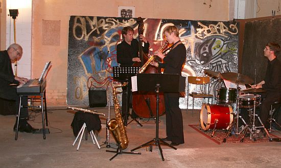 Das Peter Ortmann Quartett trifft Heiner Waniek Remscheid. Das hätte auch Ernst Jandl (1925-2000) gefallen: Peter Ortmanns nahtloses dreiteiliges Jazz-Intro zu Heiner Wanieks Vortrag von Jandls „wo bleibb da“, „die wanderung“ und „die tassen“. Das in den 60er und 70er Jahren zur Blüte gelangte Genre Jazz & Lyrik feierte am Dienstagabend mit Charlotte Ortmann (ts, ss, fl), Dominic Brosowski (dr), Caspar van Meel (b) und Peter Ortmann (p) im Remscheider kunstraum basilica und im Verein mit Heiner Waniek fröhliche Urständ. Mit Musik von J.S. Bach bis Hanns Eisler, von Robert Schumann über Thelonious Monk bis Charlotte Ortmann spannte sich der Bogen zu Texten von Jandl, Kurt Schwitters, Eugen Gomringer, Carl Michael Bellman und Friedrich G. Klopstock. Die 8. Bergische Biennale für Neue Musik und die von Peter Ortmann entwickelte Perfomance „Tri-A-tonus“ machten es möglich. Man hört sie nicht oft, Kurt Schwitters´ „Ursonate“ – wenn aber, soll sie so klingen wie aus Wanieks energischem, die Metrik des Dada-Poeten nachempfindenden Bariton. Daß diese Texte bei Heiner Waniek in bewährten Händen, besser: Stimmbändern liegen, machte den Abend mit dem virtuosen Jazz des Quartetts zu einem einzigen Quell der Freude. Ist Waniek doch als geradezu akrobatischer Spezialist für konkrete Poesie, experimentelle Lyrik und Werke des Dada weit über die Region bekannt. Auch eine Tänzerin (Hilke Kluth) war dabei, die rotmähnig im Hintergrund auf wackelndem Podest turnend und schließlich in eine Mülltonne (sic!) steigend zur irritierenden Marginalie wurde.