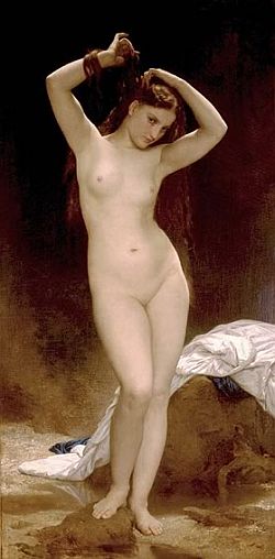 Wir haben alle eine Vorstellung dessen, was in unserem eigenen Sinn und für unseren ganz subjektiven Geschmack das Ideal sei. Alle. Unser aller Augen ruhen mit Wohlgefallen und unverhohlener Lust auf der Abbildung des Schönen, sei es eine erhabene Landschaft, eine schöne Blume, ganz besonders aber wenn der Künstler sich zu diesem Zweck der ästhetischen Darstellung des unbekleideten Körpers bedient. Niemand spreche sich davon frei. Der französische Maler William Adolphe Bouguereau (1825-1905), Lehrer von Henri Matisse und geradezu archetypischer Vertreter des Fin de siècle, drückte in seinen opulenten Tableaus und Allegorien aus, wie sich die Gesellschaft das weibliche Ideal seiner Zeit vorstellte. Edel in Erscheinung und Wuchs, zugleich vornehm und keck im Blick, Lippen, die geküßt werden wollen und Brüste, die sich fordernd recken, von einer gewissen Pikanterie und und kaum verborgener Erotik, doch den Seiltanz zwischen provokant und keusch perfekt ausbalancierend.