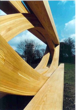 Von dort oben bietet sich andererseits auch ein weiter Blick über die Seenlandschaft des Goitzschesees. Tatsächlich sind die in dem Bogen aus der Ferne sichtbaren Ebenen begehbar. Es handelt sich um Fußgängerrampen mit einem sanften Gefälle und einer Gesamtlänge von 540 m. Diese begehbare riesige Stahlskulptur ist von Claus Bury. Für Fans dieses Bildhauer- Architekten muss jedenfalls der alte Spruch etwas unklarer Herkunft gelten: Und treffen wir uns nicht in dieser Welt, dann treffen wir uns in Bitterfeld. Oder man hat sich in Frankfurt getroffen. Die Entstehungsgeschichte dieses bisher größten Projektes von Claus Bury, der seit 1979 Großskulpturen entwirft und baut, wurde nämlich in der Ausstellung im Deutschen Architekturmuseum Frankfurt/Main dokumentiert (23.02.-22.04.2007). Zur Ausstellung erschien der Katalog: Claus Bury – Gegenläufig – Low Tide, High Tide - bei Hatje Cantz. Gegenläufig sind nicht nur die Bögen des Bitterfelder Bogens. Gegenläufig, ungewohnt und neu sind die Blicke und Aspekte des in dieser Ausstellung bzw. in diesem Band vorgestellten Werks von Claus Bury. Bauernarchitektur und die Tempel von Paestum und Yucatan