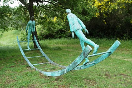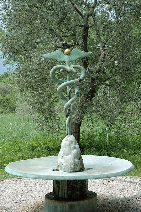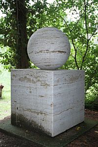 Hier der zweite Teil eines Bildberichts, der einige Arbeiten jener Künstlerinnen und Künstler zeigt, die Spoerri für seinen Garten ausgewählt hat. Historisch betrachtet steht eine Replik des „Steins des guten Glücks“ von Johann Wolfgang von Goethe am Anfang – eine Arbeit, die in ihrer radikalen Reduktion auf die stereometrischen Grundformen Kubus und Kugel dem Bauhaus alle Ehre gemacht hätte. Zentral ist sodann – in Bronze gegossen – das großartige plastische Œuvre der Schweizer Material- und Objektkünstlerin Eva Aeppli, das von Skulpturen, Installationen und Environments anderer, Spoerri nahestehender zeitgenössischer Kunstschaffender flankiert wird, die unterschiedlichste Positionen plastischen Gestaltens in der zweiten Hälfte des 20. und zu Beginn des 21. Jahrhunderts markieren.