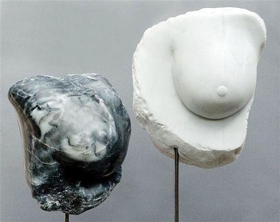 Granitblöcken Torsos, ätherische Silhouetten, Köpfe, aber auch abstrakte Formen. Eines haben fast alle gemeinsam: das haptische Vergnügen. Denn darin liegt der besondere Reiz der Steinbildhauerei – daß man das Produkt beherzt anfassen kann. Auch das von subtiler Erotik umwehte ausgesprochen weibliche. „Es fällt auf, daß die meisten Menschen Scheu haben, die Brüste zu berühren, die ich wegen ihrer natürlichen Weiblichkeit und des Symbols des Nährenden sehr gerne mache“, schmunzelt die Künstlerin. Einflüsse afrikanischer Kunst, Henry Moores, Alberto Giacomettis und Hans Arps sind nicht zu übersehen. „Das darf auch durchaus durchschimmern“, so Alexandra Harth. Wir sehen es beispielhaft an den eingefügten Fotografien.