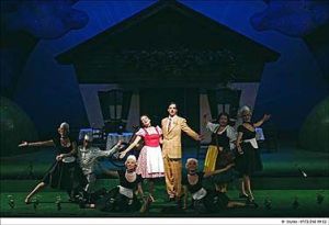 Das Regie-Team bediente diese Erwartungshaltung sogar 200-prozentig. Es durfte mitgesungen, -geschunkelt und –geklatscht werden wie beim allerheiligen „Grand Prix der Volksmusik“ im ZDF. Selten war soviel Fröhlichkeit aus den heiligen Hallen des Krefelder Stadttheaters zu vermelden. Sic ! Vielleicht auch irgendwo verständlich, hatte die Direktion dem ehrenwerten Publikum in dieser Saison doch ziemlich harte Brocken (letztlich noch: „das Fest“, ein „Frauenorchester von Auschwitz“, den „Tod in Venedig“ sowie den des „Handlungsreisenden“, Schönbergs „Erwartung“ + eine Barockoper in der Irrenanstalt) aufgetischt. So war die Reaktion meines süddeutschen Nachbarn „Jo mei – ach wär´s Theaterl doch immer so schön gscheit, wia heut´!“ sicherlich auch mannigfacher Herzenswunsch gestresster Theaterbesucher zum Abschluß der Saison. Herzig! Alles war so richtig herzig. Die Bühne - welch selige Öde auf wonniger Almhöhe - ist putzig ausstaffiert; kunstrasengrün saftig ist die Weide, blau der Strahlen-Himmel, fröhlich grinst die Sonne und die (Kaffee)-milchgebenden (Papp)-Kühe muhen fröhlich dazu; felsig sind die Faller-Styropor-Berge und niedlich witzig die unvermeidliche Märklin-Modelleisenbahn Spur Null. Ausgesprochen brüllend komisch und mit Sonderbeifall schon ohne Vorleistung bedacht sind die 8 Hornochsen (sprich: Musiker), wenn sie sich in dieser possierlichen Maskerade dem Publikum