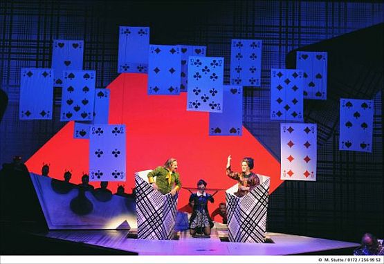 Robert Schrag (Bühne & Kostüme) gelingt ein Zauberkasten unendlicher Vielfalt, als wären wir in einem Film von Tim Burton gelandet. Farbenfrohe Kartenmotive aller Orten, und die Einheitsbühne mit vorgezogener Spielebene erscheint durch die wunderbar fast choreografisch beweglichen Zusatz-Elemente von Kartenhäusern der vielfältigsten Art wie ein bezauberndes Alice-im-Wunderland-Universum - kühne Farbenpracht und Lichtregie. Die Bühnentechnik arbeitet brillant, so sollte es immer es sein!