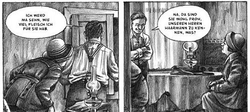Grausige 175 Seiten stark ist die jetzt im Carlsen-Verlag erschienene Graphic Novel mit dem Titel "Haarmann". Die von Peer Meter aufgezeichnete Geschichte, die Isabel Kreitz mit Schwarz-Weiß-Zeichnungen illustrierte, erzählt die letzten Monate im Leben des wohl bekanntesten deutschen Serienmörders Fritz Haarmann. Der Rezensent mußte beim Lesen der Graphic Novel an seine Jugendzeit nach dem Zweiten Weltkrieg denken, als ein Lied über den Massenmörder kursierte: "Warte, warte, nur ein Weilchen / dann kommt Haarmann auch zu Dir / mit dem kleinen Hackebeilchen / macht er Schabefleisch aus Dir."