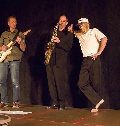 Unterstützt wird der Pantomime an diesem Abend von den drei Jazz-Musikern Andre Enthöfer (Saxophone; Klarinetten ), Michael Gustorff (Geige) und Jörg Lehnhardt