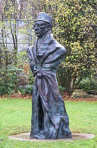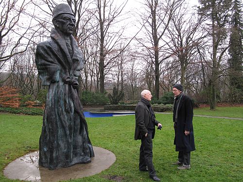 3,70 m ist er hoch, also etwas mehr als doppelt so groß wie der durchschnittliche deutsche Staatsbürger. Ein wenig Größe darf man von „Vater Staat“ aber auch erwarten. Thomas Schütte hat nach drei Jahren dem sanften Drängen von Tony Cragg nachgegeben und ihm für seinen Wuppertaler Skulpturenpark „Waldfrieden“ ein, notabene kostbares, Werk als Dauerleihgabe zur Verfügung gestellt. An bevorzugtem Platz auf der Freifläche zwischen der anthroposophischen Villa Waldfrieden des einstigen Besitzrs Dr. Kurt Herberts und dem gläsernen Ausstellungs-Kubus hat die beachtliche Bronze einer Männerfigur mit zum Teil deutlichen Gesichtszügen – schauen Sie sich mal die Augenpartie und die hohen Wangenknochen an – des ersten deutschen Bundeskanzlers, Dr. Konrad Adenauer einen angemessenen Standort gefunden. Soll uns der Umstand etwas sagen, daß die Figur armlos, also quasi hilflos ist? Daß sie von fremder Hand mit einem unsichtbaren Gürtel des bodenlangen Gewandes fest eingeschnürt wurde? Oder daß ihre Kopfbedeckung fern vom diplomatischen Dress-Code unserer Breiten ist? Kann, muß aber nicht. Und daß sie jetzt heißt, wie sie heißt, ist nichts anderes als die spontane Namensgebung durch die Mitarbeiter der Düsseldorfer Bronzegießerei, in der ihre mächtige Form ausgefüllt und patiniert wurde. Nachdem „Vater Staat“ seine Ausstellungszeit in der Bonner Bundeskunsthalle absolviert hatte, brauchte der ernst blickende Mann eine neue Heimat. Die hat er nun bei Tony Cragg mit Blick auf die schöne Villa. Den kommenden und gehenden Besuchern des Parks – 30.000 waren es 2010 – wendet er übrigens den eingefallenen Rücken zu. Kein Rückgrat? Noch so ein Hinweis?