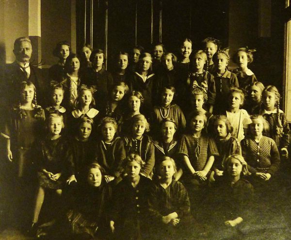 Jetzt will ich versuchen, meine Erinnerungen an diese Jahre hervorzuholen, die mit dem Besuch der dortigen Volksschule für ½ Jahr beginnen. Was die schulischen Leistungen betraf, hatte ich keine Schwierigkeiten. Weiter weiß ich von dieser Zeit kaum etwas. Aber dann kam die Aufnahme in das Lyceum, und ich möchte sagen, hiermit eine ganz neue Erlebniswelt für mich. Unser Klassenlehrer wurde der an dieser Schule allseits beliebte Lehrer, „Pappa“ Görsch, weißhaarig und mit weißem Schnäuzer. Ein Einschulungsbild zusammen mit ihm zeigt mich ganz unscheinbar inmitten der anderen Mitschülerinnen; aber er steht wirklich stattlich hinter der Klasse.