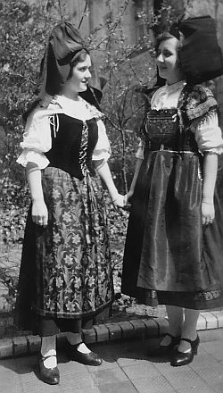 Geburtstagsfeiern zu Silvester Zu Silvester, an meinem Geburtstag, wenn sich sehr viele Familienmitglieder bei uns versammelten, wurde unser nicht gerade riesiges Wohnzimmer zum Tanzparkett. Die Möbel wurde soweit wie möglich zusammengerückt, Schallplatten aufgelegt, und wir tanzten! Das war gemütlich und vergnügt. Inge, die natürlich auch dabei war, wurde neben dem Kachelofen in eine Ecke gesetzt und konnte bis zum Einschlafen allem beiwohnen. Wenn ich überlege, dann waren wir manchmal 10-12 Personen! Und wir haben es nicht als zu eng empfunden. Fröhlich feierten wir ins Neue Jahr. Später, als ich größer war, habe ich es oft verwünscht, am 31. Dezember Geburtstag zu haben, alle feierten bei mir, gingen dann nach Hause und für mich begann das Neue Jahr mit Aufräumen, Abwaschen und Saubermachen! Eines Tages - aber da war ich schon verheiratet - habe ich dann gestreikt und gesagt: „Schluß mit meinen Geburtstagsfeiern, ich möchte das neue Jahr auch mal in Ruhe beginnen und nicht mit Arbeit!“ Es hat funktioniert. Aber schön waren die Feiern in unserer alten Wohnung in der Menzelstraße doch. Für mich sind sie unvergessen! Meine Freundin Margot verließ unsere Schule schon 2 Jahre früher und besuchte eine Handelsschule, was unserer Freundschaft keinen Abbruch tat, da wir uns ja täglich in der Menzelstraße trafen. Margots Eltern waren Mitglieder im Club der Elsässer, weil ihr Vati ein gebürtiger Elsässer war. Es war einfach selbstverständlich, daß ich mit von der Partie war, wenn der Club sein Jahresfest feierte. Einmal nahmen wir beide in echten Elsässer-Kostümen an einem Umzug zum 1. Mai teil, eine Veranstaltung, die die Nazis ins Leben gerufen hatten. Wir hatten mit der Politik ja absolut nichts zu tun, es machte uns nur einfach Freude, dabei zu sein.