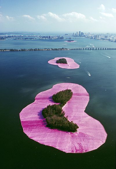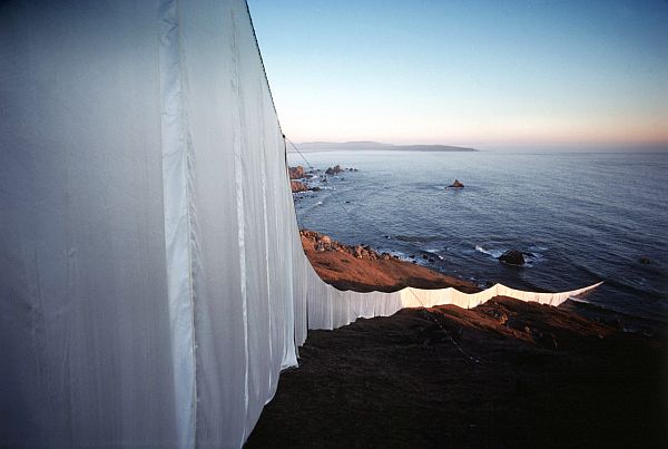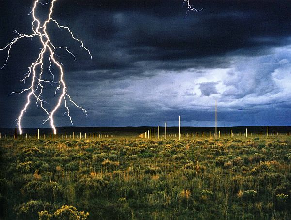 Fotografisch dokumentiert wird in Koblenz eines der Schlüsselwerke der Land Art, nämlich Walter De Marias „Lightning Field“ von 1977 (s.o.) Auf einer Hochebene im US-Bundesstaat New Mexico hat der Künstler in einem rechteckigen Geviert von ca. 1,6 x 1,0 km in regelmäßigen Abständen 400 Edelstahlstäbe errichtet, deren Spitzen alle die gleiche Höhe über Null-Niveau erreichen und somit eine imaginäre horizontale Fläche bilden. Da das Gelände aber uneben ist, haben die Metallstäbe unterschiedliche Höhen (zwischen 4,6 und 8,1 m). Diese gigantische, die Landschaft streng geometrisch artikulierende Skulptur vollendet sich erst durch Mitwirkung der Naturgewalten, nämlich dann, wenn bei heftigen Gewittern die Blitze zwischen den Metallstäben einschlagen. Daher auch der bezeichnende Titel „Lightning Field“, also „Blitzfeld“. Zu den spektakulärsten und bekanntesten Interventionsprojekten im Landschaftsraum gehören die Verpackungs- und Verhüllungsaktionen des Künstlerehepaars Christo und Jean-Claude. Anders als bei anderen, oft recht spröden Land Art-Projekten handelt es sich bei diesen – immer zeitlich befristeten – Aktionen um hochgradig ästhetisierte Naturverfremdungen, denen von Anfang an die besondere mediale Aufmerksamkeit und Akzeptanz des Publikums sicher war. Erinnert sei nur an Großprojekte wie „Verhüllte Küste“ (1969), „Valley Curtain“ (1971/72), „Running Fence“ (1976), „Surrounded Islands“ (1983) oder die Verhüllung des Berliner Reichstags 1995.