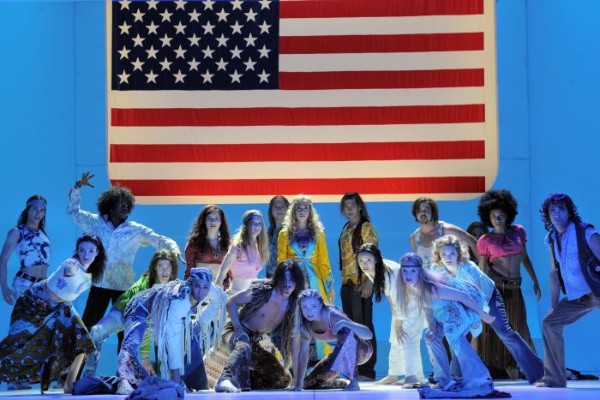 Das Stück heute zu inszenieren, erfordert nicht nur Feingefühl, sondern der Regisseur muß auch zeigen, warum uns dieses Musical noch soviel Arbeit, Engagement und Zeit wert ist. Es ist der Versuch einer Art Quadratur des Kreises, und die gelingt Regisseur Philipp Kochheim und seinem Team auf geradezu geniale Art und Weise, indem er z.B. historische Momente per Video einblendet. Wir sehen Bilder, welche die Welt bewegten. Ob John F. Kennedys verlogenes Weltmacht- und Friedengegefasel, Martin Luther Kings bewegende „I have a dream“-Rede oder Bilder aus Vietnam, wo US-Kampflugzeuge das alles vernichtende Agent Orange versprühen, welches unendliche schöne Landflächen nicht nur auf 100 Jahre entlaubte, sondern auch Hunderttausende unschuldiger vietnamesische Bauern vergiftete bzw. deren Nachwuchs verkrüppelte. Eines der größten Verbrechen der Menschheitsgeschichte! Das läßt erschauern zwischen so schöner Musik und so anscheinend harmlosen Hippies.