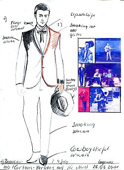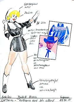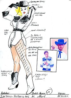 OF: Ich bemühe mich meine Hausaufgaben zu machen. Also, „Curtains“ wird eine wild bunte Crazyshow, mit gepfefferten Dialogen, grandioser Musik, exzellenten Darstellern und einer fantastischen Ausstattung? BB: Nicht zu vergessen Jean Redshaws Regie. OF: Genau. BB: Premiere ist am 5. November. OF: Meinerseits steht der Termin. BB: Aber am Samstag geht erst einmal die Traviata raus, wollen Sie mit zur GP. OF: Danke für die Einladung, gerne! Für die Kostümentwürfe für "Curtains" herzlichen Dank an INGOMAR