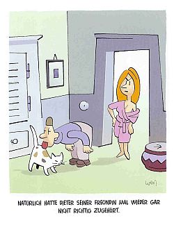 | Zuhören vermeidet Mißverständnisse! "Männer sind Schweine...", haben mal die "Ärzte" eine Hit-Single getitelt und damit einen ihrer größten Erfolge gelandet. Wer hat die Platten gekauft? Richtig: Frauen! Daß Männer Deppen sind und Frauen nicht Auto fahren können, belegt Martin Perscheid mit seinen Cartoons. Seit wir Karsten Weyershausens Zeichnungen kennen, kristallisiert sich immer mehr heraus, daß das Problem weit komplexer ist: mit Depp und Schwein ist es nämlich beileibe nicht getan - das Problem sitzt tiefer. Männer sind, so jedenfalls