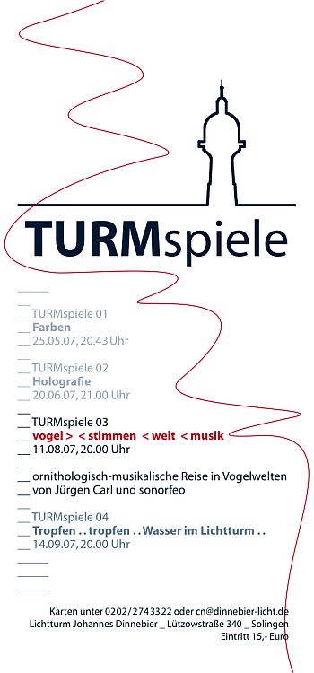vogel> <stimmen <welt <musik Der Lichtturm von Johannes Dinnebier in Solingen-Gräfrath ist zu einem Ort aus dem üblichen Rahmen fallender, besser: herausragender Kunstveranstaltungen geworden. Dieses herrliche Bauwerk, ein mit einer kühn konstruierten Glaskuppel zum „Lichtfinger“ auf einer markanten Anhöhe der Bergischen Landes umgebauter ehemaliger Wasserturm, verlangt nach außergewöhnlichen Äußerungen, weil er selbst außergewöhnlich und inspirierend ist. Die TURMspiele wollen alle Sinne ansprechen und werden Musik, Poesie, Theater, Lyrik, aber auch wissenschaftliche Vorträge, Wetterbeobachtungen, Architektur, Philosophie und Astronomie über einen Zeitraum von mehreren Jahren zu einem Gesamtkunstwerk verflechten. Das Thema der TURMspiele 03 – Farbspiele und Holographien waren im Mai und Juni Anziehungspunkt - ist die Welt der heimischen Vögel. Wir alle haben sie schon oft gehört. Für die einen ist es süßer Gesang, für die anderen eine „nächtliche Ruhestörung“. Wer sind sie, wie leben sie, wo findet man sie und welche Musik machen sie? Jürgen Carls ornithologisches Wissen und die musikalischen Ideen von Matthias Nahmmacher (Flöte), Ulrike Nahmmacher (Violine) und Dietmar Wehr (Kontrabass) werden die Turmspitze am 11. August ab 20.00 Uhr in eine gläserne Voliere verwandeln. Karten unter 0202 -2743322 oder cn@ddinnebier-licht.de
