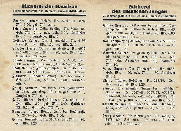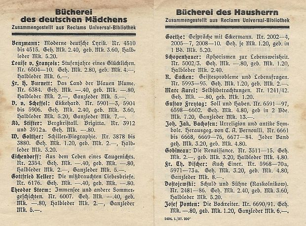 und die deutschen Jungen und Mädel anno Tobak lesen sollten... Nebenbei: Eichendorffs "Taugenichts" und Friedrich Theodor Vischers "Auch einer" sind die schlechtesten Tips auch heute nicht! |