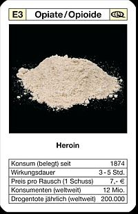 Dafür können wir dank "Weltquartett" erfahren, was denn so ein jeweiliger Drogenrausch unter dem Strich kostet, also was man anlegen muß (außer sich mit dem Gesetz und dem Dealer), um sich eine ordentliche Dröhnung zu verschaffen. Da sind Schnaps, Lachgas, Äther, Cannabis und Fliegenpilz eindeutig billiger als z.B. Kokain, Crack, LSD, Opium, Meskalin Heroin (übrigens von der Fa. Bayer eingeführt), MDA, MDMA, DOM oder 2C-T-7. Allerdings dauert der Kick von Lachgas (0,50 €) mal gerade drei Minuten, während man für gediegene 6-12 Stunden LSD-Rausch 7,- € zahlt oder 6-9 Stunden Abflug mit Meskalin für 10,- € haben kann. Ist halt eine Kosten-Nutzen-Rechnung. Mit Speed kann man sich bis zu 12 Stunden für 5,- € wegschießen. Das lohnt doch. Nur böd, daß man sich mit all dem Zeug die Birne rettungslos aufweicht. Und irgendwann nur noch sabbert.