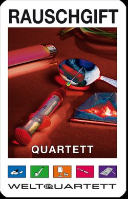Und jetzt kommt´s: keines dieser lustigen Lieder ist verboten, obwohl jährlich durch den Mißbrauch des Alkohols geschätzt 1,8 Millionen Menschen sterben. Seit mehr als 10.000 Jahren werden alkoholische Getränke zur Rauscherzeugung konsumiert, nur Meskalin und Fliegenpilz haben eine längere Überlieferung in der Geschichte des Drogenrausches. Und nur an Zigaretten sterben mehr Menschen als an Alkohol. Nämlich 5,4 Millionen jährlich weltweit. Wußten Sie das? Ich nicht. Das und vieles andere kann der Quartettfreund beim heimeligen Spiel im Familienkreis am Sonntagnachmittag – das Spiel ist Familien ganz besonders zu empfehlen – lernen, legt man einmal das „Rauschgift-Quartett“ aus.