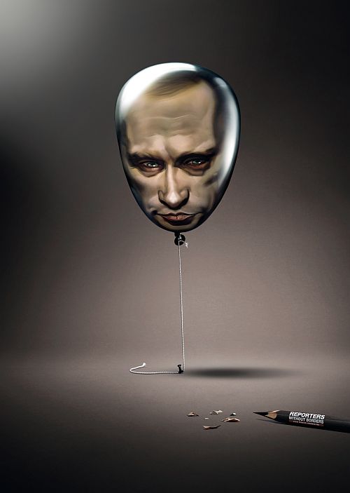in Rußland zum Präsidenten gewählt worden. Gerhard Schröder hält ihn ja für einen lupenreinen Demokraten. Andere hingegen glauben, daß er der übelste Diktator ist, den Rußland seit Iwan dem Schrecklichen hatte. Fest steht, daß er über eine nahezu unbegrenzte Machtfülle in dem wieder aufrüstenden riesigen Staat hat, der sich über den größten Teil der Landmasse Eurasiens ausdehnt. Die russische Journalistin Masha Gessen hat Putin in ihrer kritischen Biografie den "Mann ohne Gesicht genannt". Bernd Ertl hat ihm für die Kampagne "Reporter Without Borders" eines gegeben. |